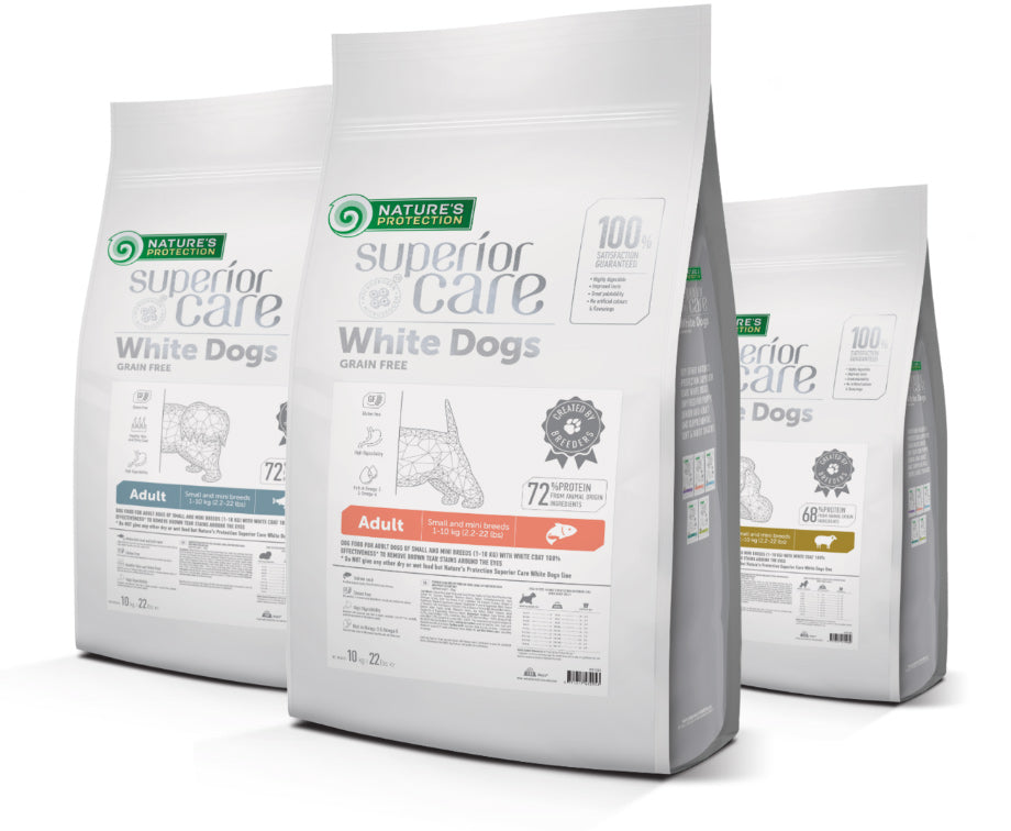 Nature's Protection Superior Care Line - Unsere Züchter haben gemeinsam mit Tier- und Tierernährungsexperten ihre Forschungs- und Fertigungstechnologien ins Leben gebracht, um Probleme mit weißen, hellen, roten, schwarzen und anderen empfindlichen Hunden zu lindern. Aufgrund spezifischer Bedürfnisse, Fellfarben, Hautzustand und Immunsystem benötigen diese Hunde maßgeschneiderte Lösungen, die durch modernste Ernährung zur Verfügung gestellt werden können.